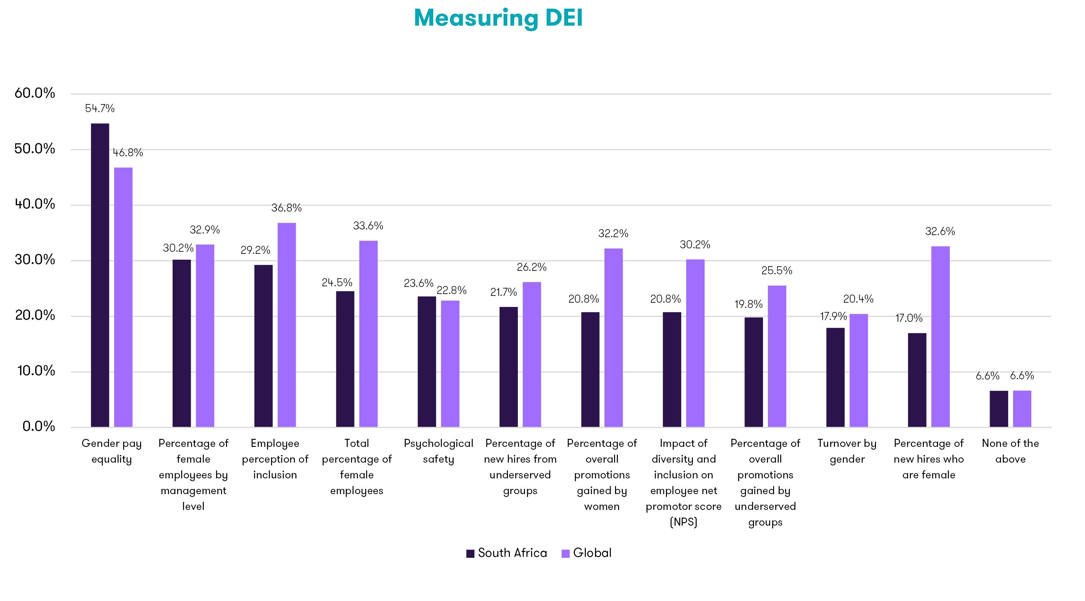 The analysis of the impact different measurements have on the percentage of senior management roles held by women reveals significant variation, as shown in the graph below. However, if there are clear indicators of DE&I performance being measured, businesses will outperform the global benchmark.