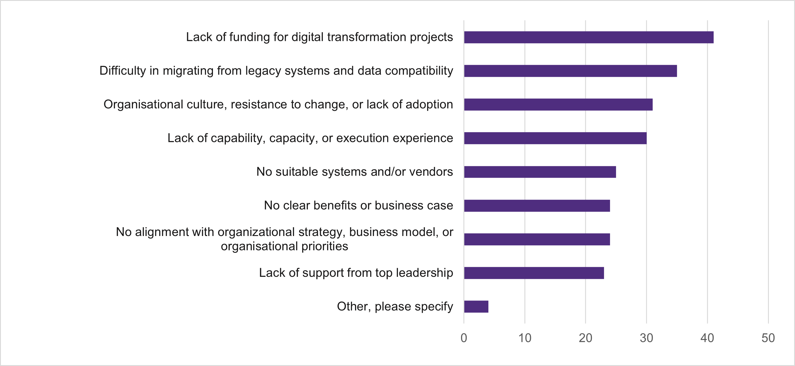 Technology is advancing rapidly; therefore, it is important that funders understand what they are investing in. There is a need for a strong business case advocating for the transformation and related benefits of technology, as well as making sure that funders and senior executives understand the reasons and benefits of introducing advanced technologies so they can invest confidently. The difficulty in migrating legacy systems and compatibility challenges can be overcome by rationalising the current processes. Implementing inefficient processes into a new digital platform will not yield the benefits. Training and reskilling people, while encompassing cyber safety will support an easier adoption of technology.