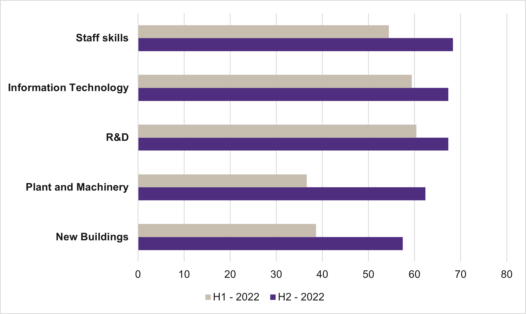 Technology investment is the key area businesses are focused on, cited by 53% of EMEA businesses (down from 54% in H1 2022), followed by investment in staff skills at 50% (down from 52% in H1 2022) and investment in research and development at 46% (down from 48%), however, investment in new buildings and machinery have picked up momentum in term of what the mid-market business would invest in post-Covid-19 and that is due to the base set during the Covid-19 pandemic.