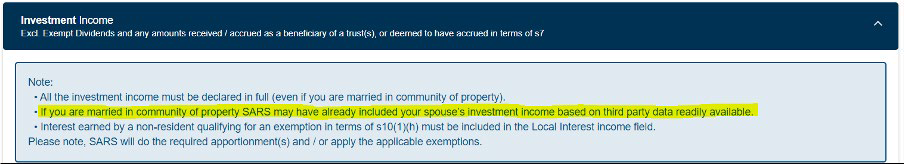 The amount will then be taxed 100% in your hands upon assessment. SARS will inform the primary spouse that 50% of his/her investment income is taxed due to being married in community of property (COP) and that the remaining portion will be taxed in the hands of the other spouse. The below note is included in the investment container which informs taxpayers of the obligation of apportionment with regards to a 50/50 split.