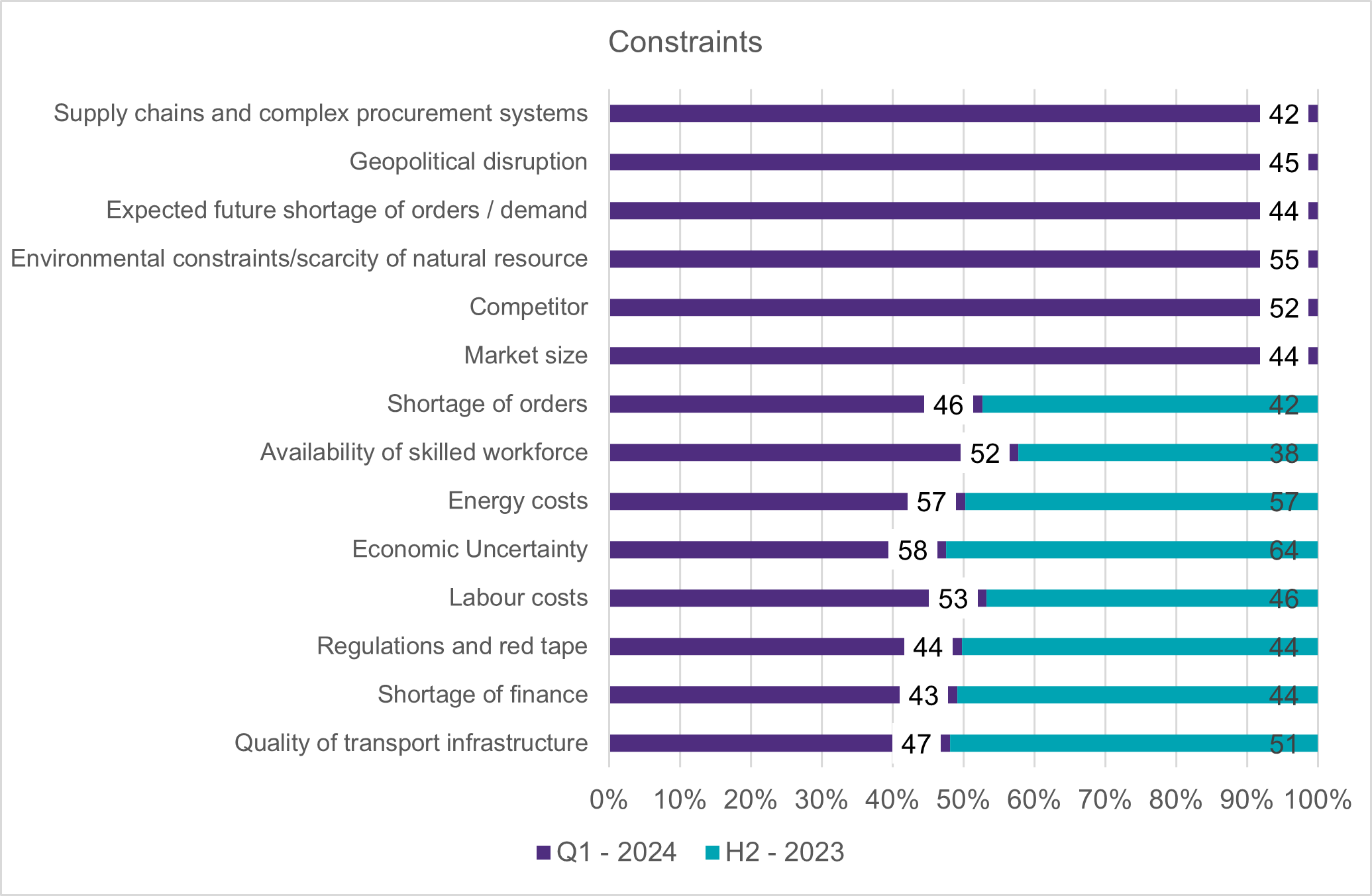 Regulation and red tape have remained unchanged at 44%, suggesting ongoing bureaucratic challenges for mid-market businesses, resulting in businesses treading carefully in an election year. The election outcome could influence regulatory frameworks, potentially easing or exacerbating these hurdles. The survey data has added six more new constraints which we will look at in the next coming quarters for a better analysis
