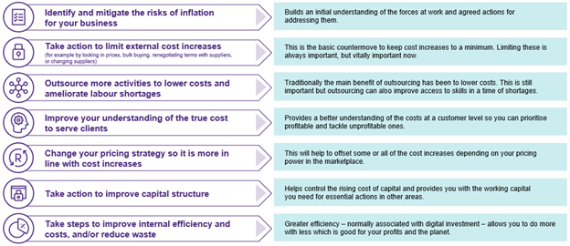 To negate financial challenges during inflation, mid-market businesses would need to implement short to medium-term strategies. This issue was covered in the H1 2022 IBR report, where we provided guidance on how businesses can respond to inflation and how they can use technology to increase their profit margins.