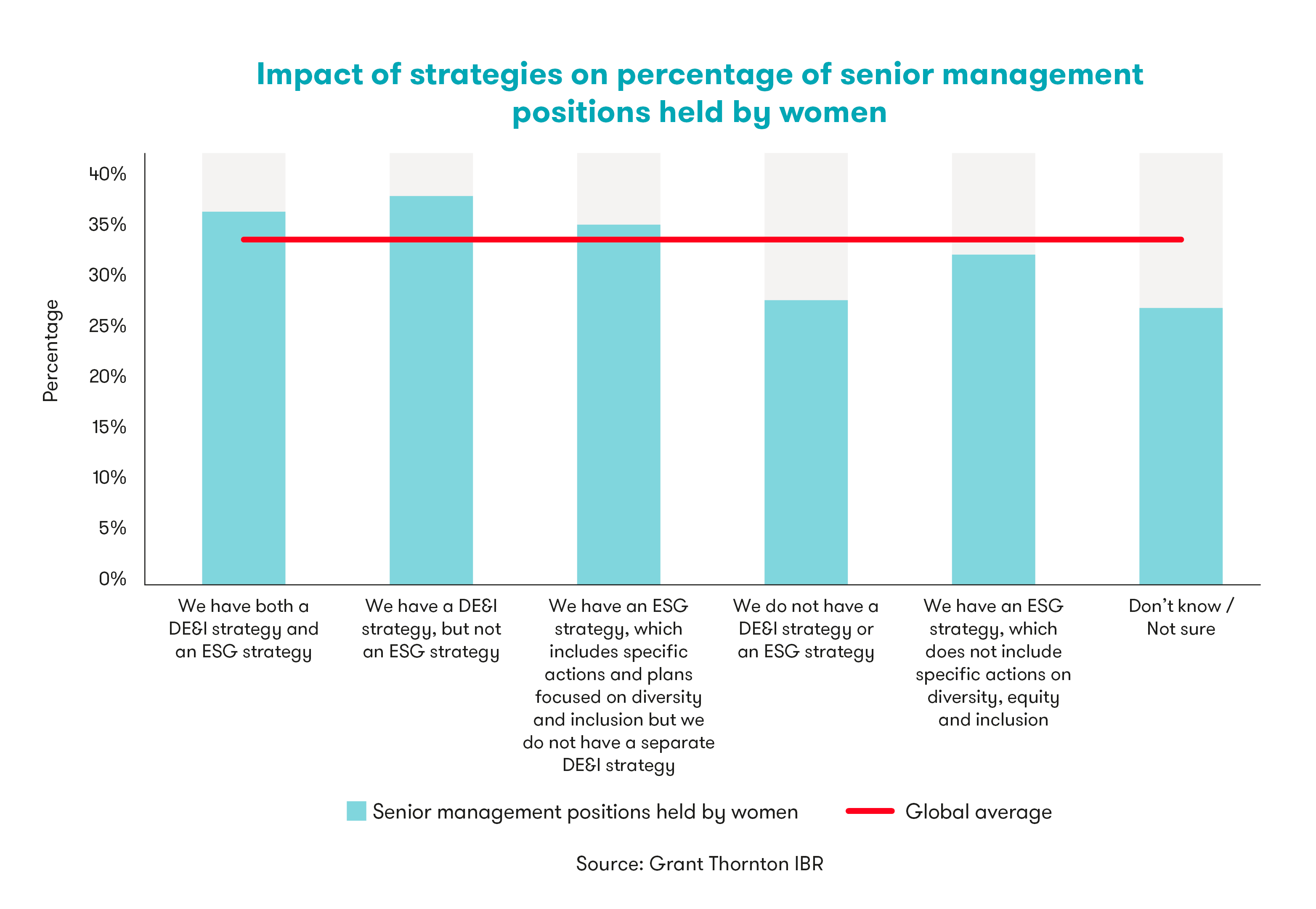 If there is no plan, there is no progress: to achieve parity of women in senior management roles, businesses need to have a DE&I strategy in place. The most successful strategy is one which focuses on DE&I alone, independent of a broader ESG strategy. This is our second pathway. Mid-market firms with both a DE&I strategy and an ESG strategy, have the highest percentage of 46.2% - more than businesses which have an ESG strategy, which includes specific